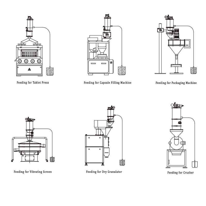 It is an automatic feeding equipment for machines including tablet presses, capsule filling machines, dry granulators, packaging machines, crushers, and vibrating screens.